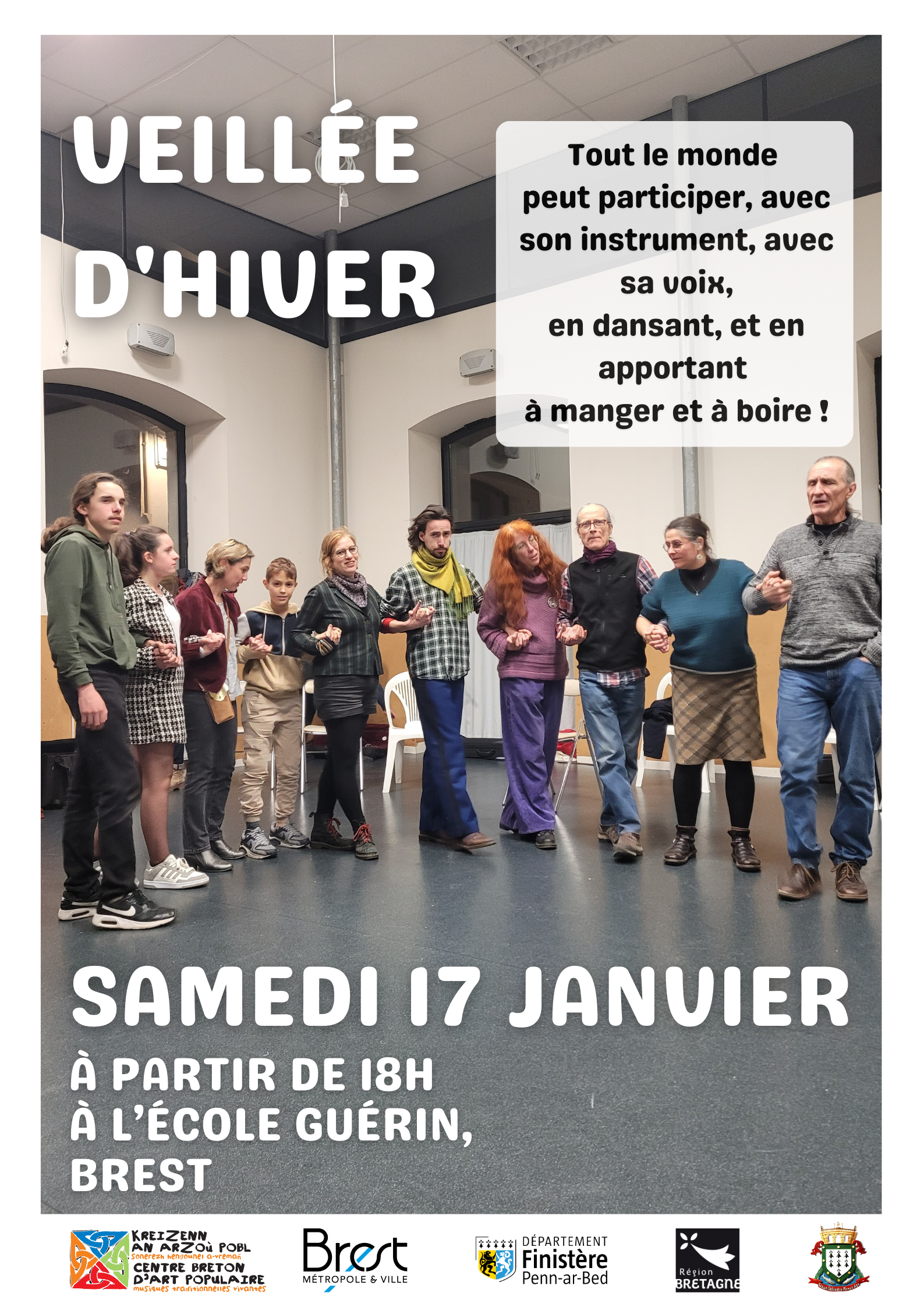 Veillée d’hiver pour les élèves de Brest et alentours. C’est à l’école Guérin. Tout le monde est bienvenu, et chacun est invité à apporter de quoi participer à l’auberge espagnole.