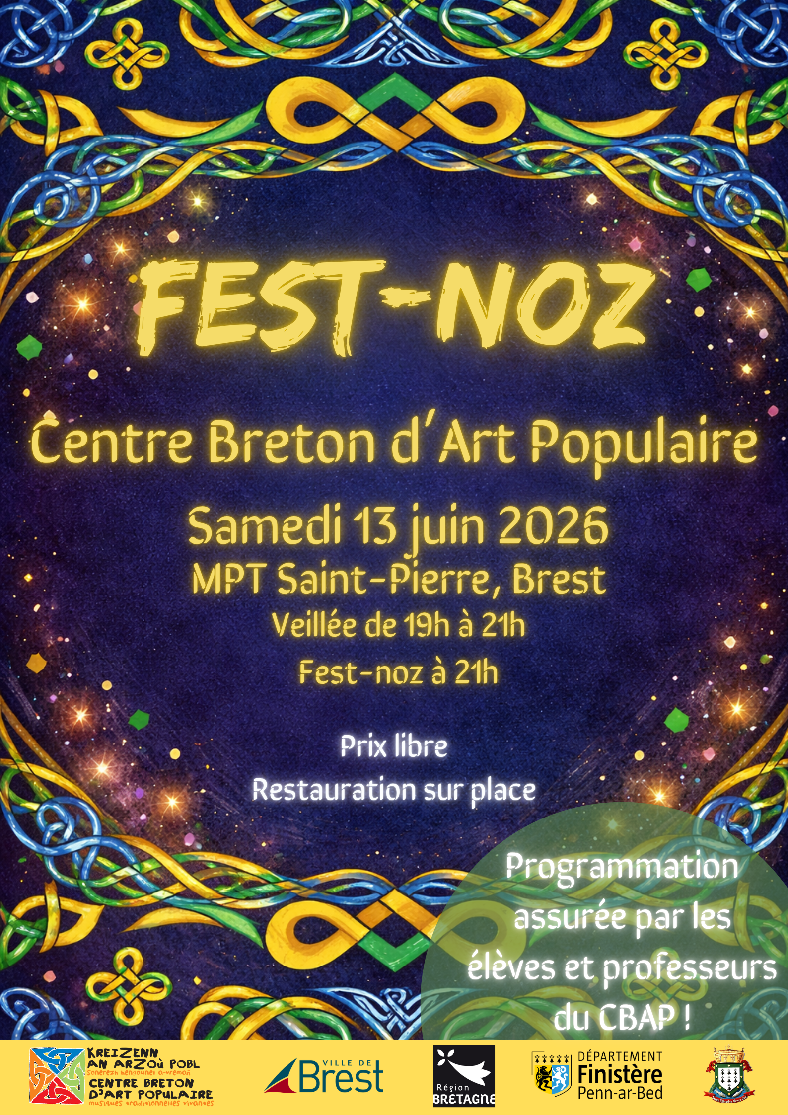 Cette année, la veillée sera suivie d’un fest-noz et se déroulera à la MPT de Saint-Pierre (Brest). 19h-21h : veillée ouverte à toutes et tous 21h-00h30 : fest-noz assuré par les élèves des ateliers du CBAP